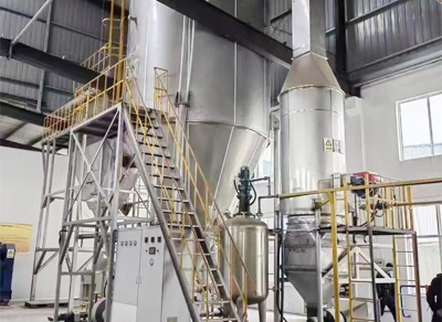 压力喷雾干燥机是一种可以同时完成干燥和造粒的装置。按工艺要求可以调节料液泵的压力、流量、喷孔的大小。得到所需的一定大小比例的球形颗粒。