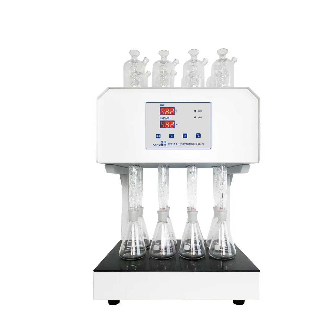 标准微晶COD消解器 采用进口微晶面板。面板为可耐800℃高温微晶板,板面发热均匀,升温、降温速度快。加热部分使用新型的进口耐高温陶瓷纤维发热盘,消解器的底板和周边的热损失小,受热、导热均匀,热效率更高。仪器主要由机身、回流管、风扇、微晶加热板等4大部分组成,采用微机PID技术进行定时控制加热电炉板和风扇,可对6个锥形瓶回流装置同时进行加热。仪器的化学溶液配制、操作和COD的计算完全遵照(HJ828-2017)重铬酸盐法,低于50mg/L的COD水样可通过稀释滴定剂和氧化剂来提高精确度,高于700mg/L的COD水样,可以通过水样的比例稀释来完成测定。